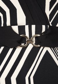 Robe noir et blanc avec un motif géométrique, décolleté drapé et coupe ajustée, présentant des accents noirs solides contrastants à la taille.
