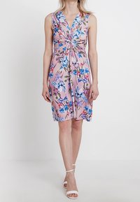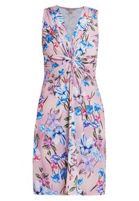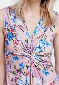 Robe sans manches à fleurs en tissu rose clair, ornée de motifs floraux bleus et roses, avec un détail noué à la taille et une jupe évasée.