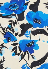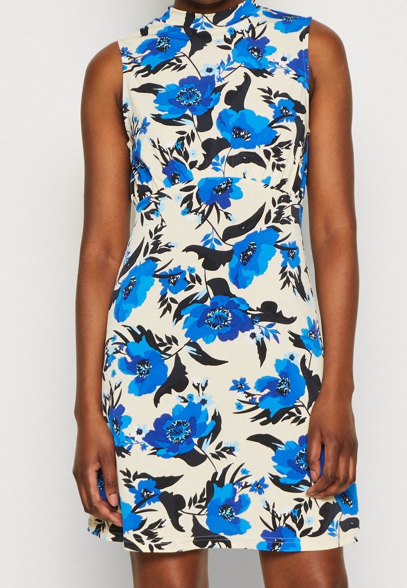 Robe sans manches florale mettant en avant des couleurs bleu, noir et crème, avec un col haut et une silhouette ajustée. Le motif comprend de grandes fleurs et des feuilles.
