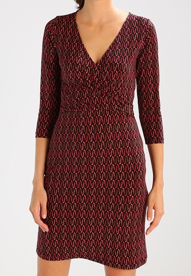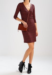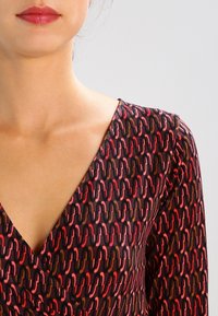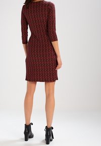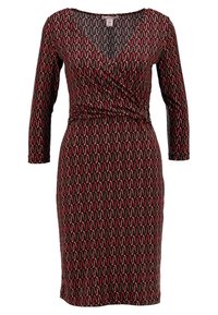 Femme portant une robe ajustée mi-genou avec des manches trois-quarts et un motif abstrait rouge et noir, dotée d'un décolleté en V.