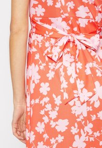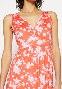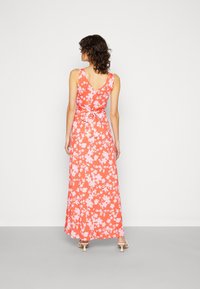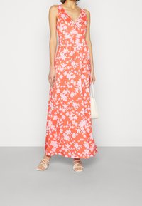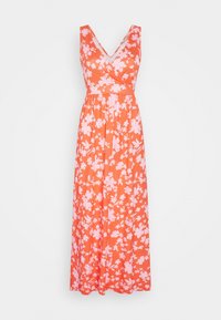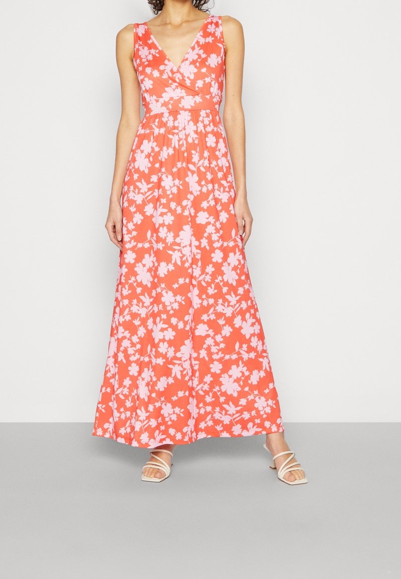 Robe maxi en corail avec un motif floral rose. Présente un décolleté en V profond et un design sans manches. Tissu léger avec une silhouette fluide.