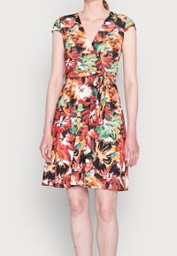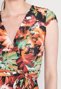 Femme portant une robe portefeuille à manches courtes, longueur genoux, avec un col en V et un motif floral vibrant en rouge, orange, vert, noir et blanc.