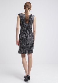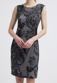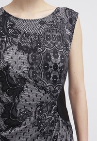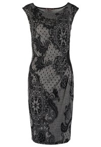 Robe cintrée sans manches avec un motif complexe en dentelle noire sur un tissu gris, dotée d'un col rond et de panneaux latéraux noirs.
