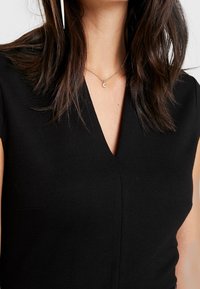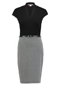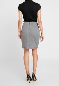 Top noir à manches courtes avec un col en V, associé à une jupe crayon grise à motifs comportant un petit imprimé géométrique et une ceinture noire.