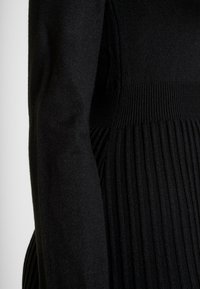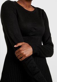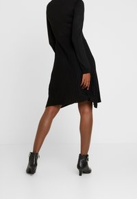 Robe noire côtelée avec manches longues, encolure ronde et ourlet évasé. Confectionnée en tissu maille doux avec une finition texturée.
