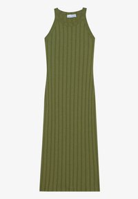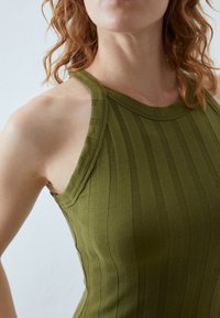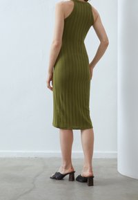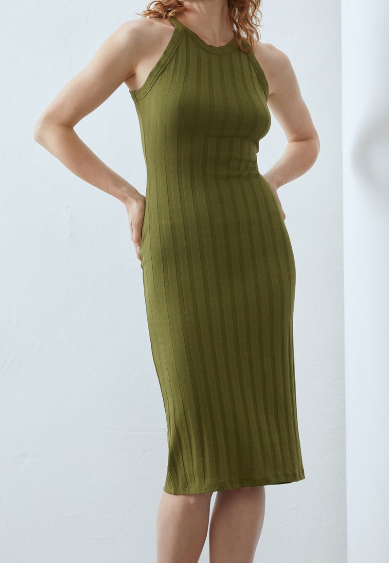 Femme portant une robe midi sans manches, côtelée, de couleur vert olive, se tenant avec les mains sur les hanches contre un mur blanc uni.