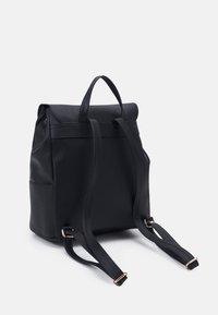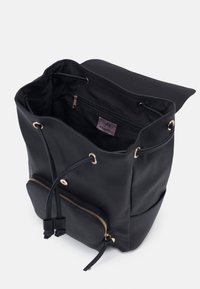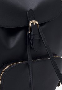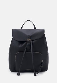 Sac à dos en cuir noir avec fermeture à rabat, poche avant zippée et finitions en métal doré. Design épuré, finition texturée et bretelles réglables.
