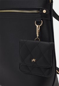 Sac à dos en cuir lisse noir avec fermeture éclair dorée et petite pochette matelassée attachée avec un fermoir doré sur fond blanc.