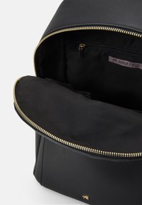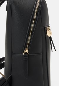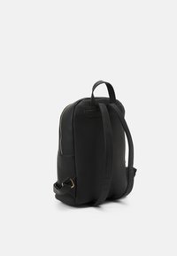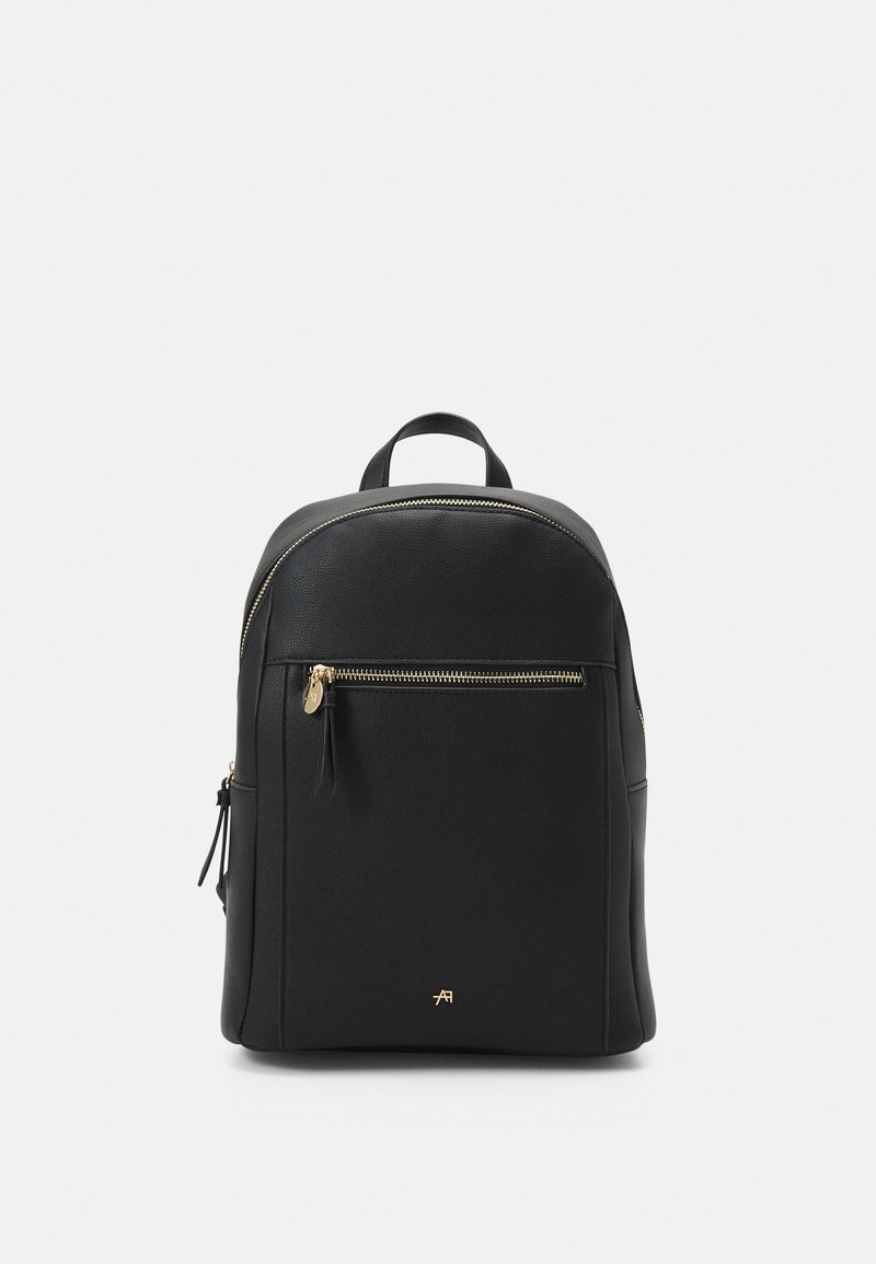 Sac à dos en cuir noir avec une poche avant zippée, des détails de fermeture éclair dorée, et un petit logo doré près du centre inférieur.