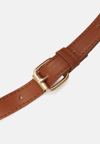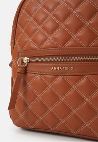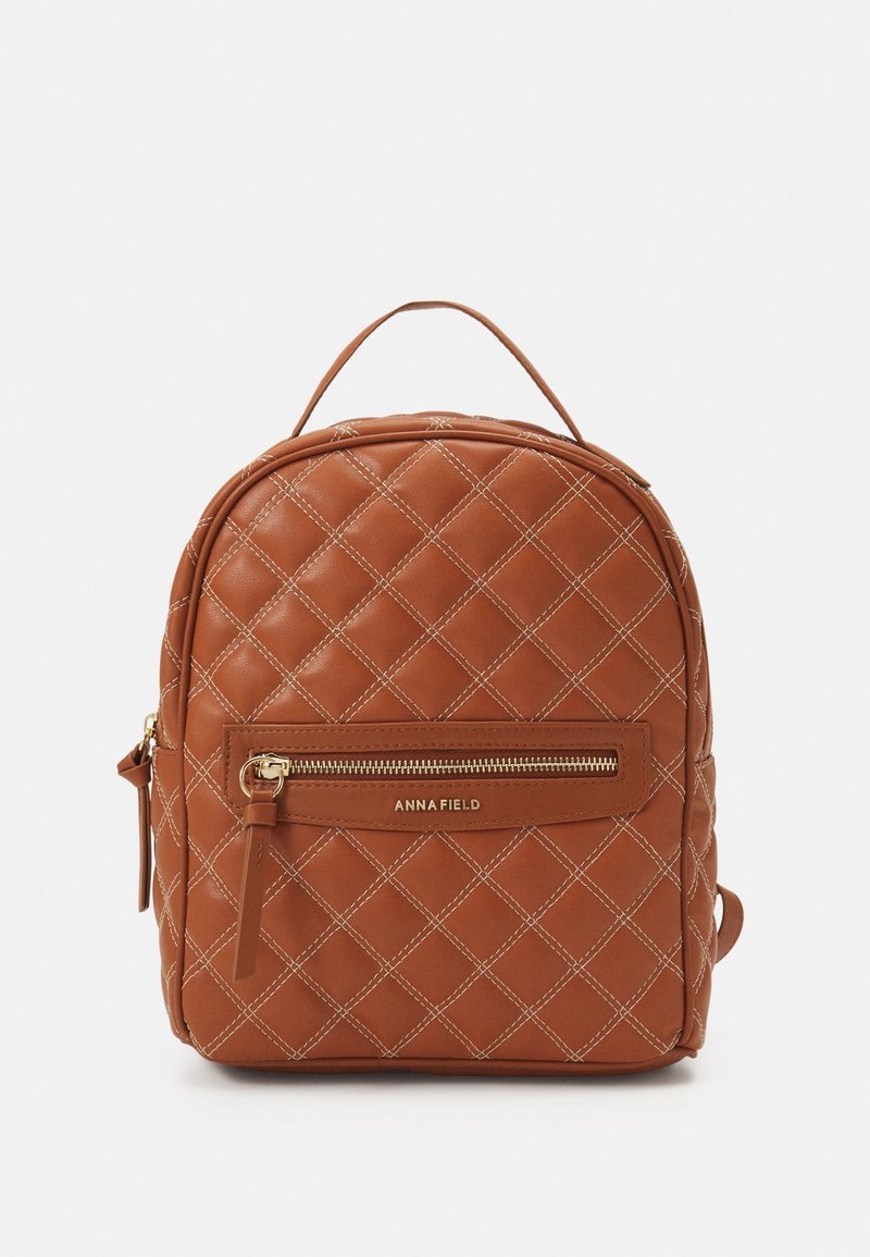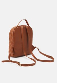 Sac à dos marron en similicuir matelassé avec une poche zippée à l'avant, des accessoires dorés et une poignée supérieure. Présente un motif de couture diagonale.