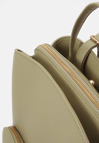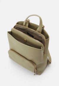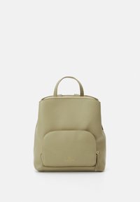 Sac à dos en similicuir vert de forme arrondie, avec une poche avant zippée et des éléments métalliques dorés. Double poignée supérieure pour un transport facile.