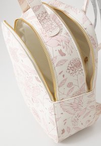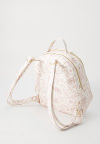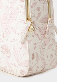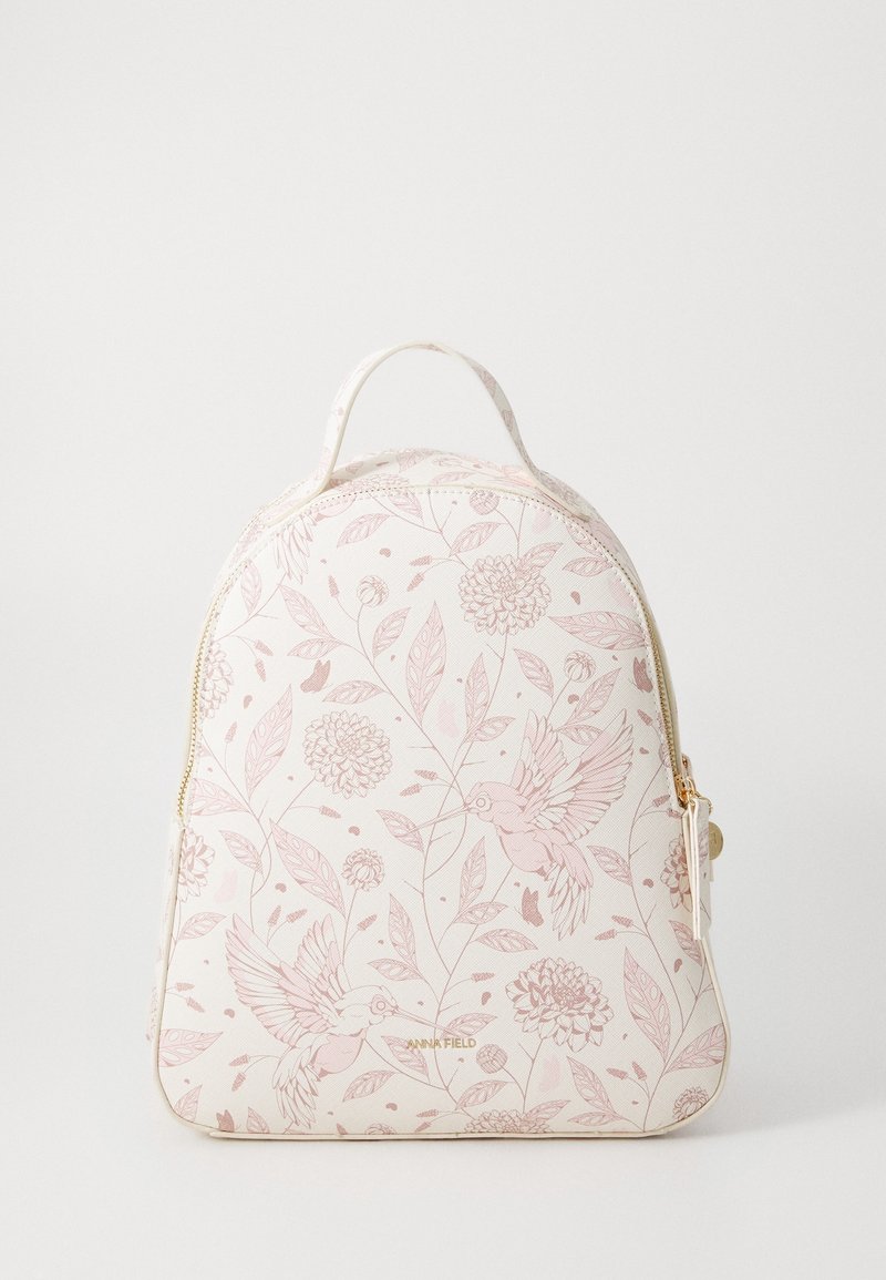Petit sac à dos crème avec un motif floral rose clair et colibri, fermeture éclair dorée, poignée supérieure, et petit nom de marque "ANNA FIELD" à l'avant.