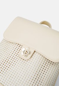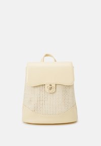 Sac à dos en similicuir jaune avec un motif tissé à l'avant, fond arrondi, fermeture à rabat et ferrures métalliques en forme de fleur.