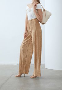 Pantalon large beige plissé, tissu léger, associé à un haut blanc à épaules dénudées et des sandales à talons hauts à lanières. Sac à main beige simple.