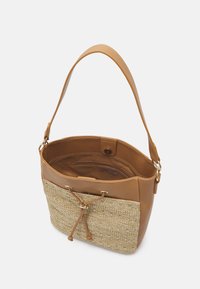 Petit sac à main avec un panneau avant tissé en crème, une bordure en cuir brun, des anneaux ronds dorés et une seule bandoulière en cuir brun.