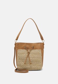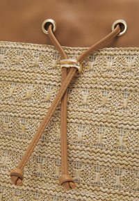 Sac bandoulière beige avec poche avant tissée, détail à cordon de serrage et sangle longue amovible sur fond blanc.