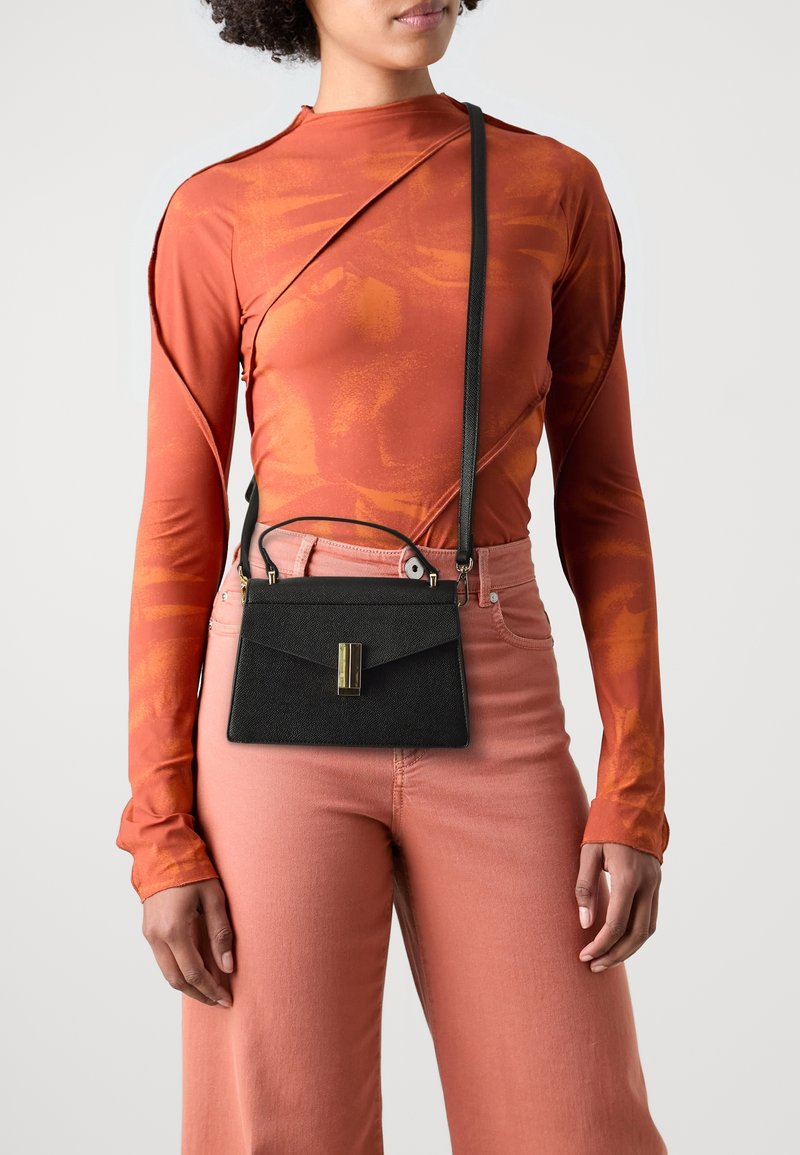 Sac à main structuré noir avec une fermeture à rabat, un accent en métal doré, et une longue bandoulière, porté avec un haut couleur rouille et un pantalon rose.