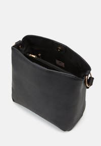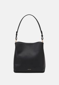 Sac à bandoulière en cuir noir à texture lisse, sommet arrondi et une seule sangle ajustable. Présente un logo de marque doré en bas.