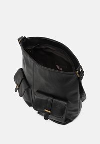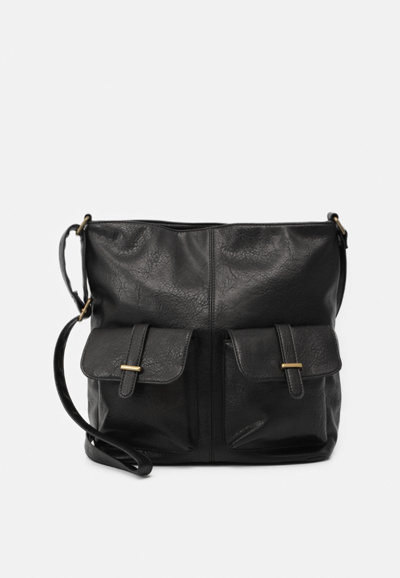 Sac à bandoulière en cuir noir avec deux poches avant à rabat et des détails de boucles dorées sur fond blanc.