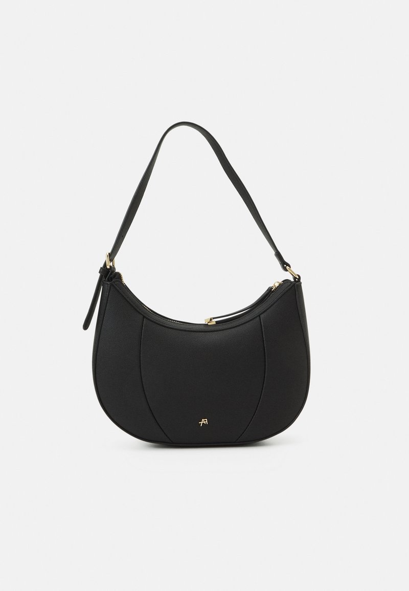 Sac à épaule noir en forme de demi-lune avec une seule bandoulière, une fermeture éclair dorée et un petit logo doré au centre sur le devant.