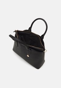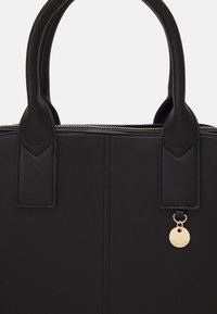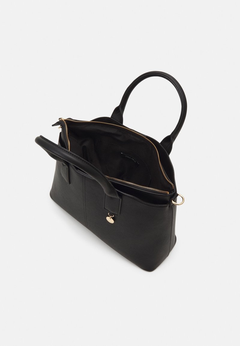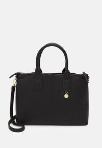 Sac à main en cuir noir avec une fermeture éclair dorée ouverte, deux anses et un petit charm doré suspendu à l'avant sur un fond blanc.