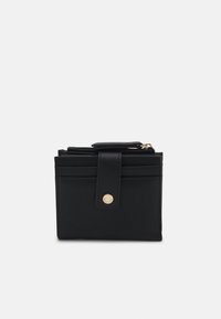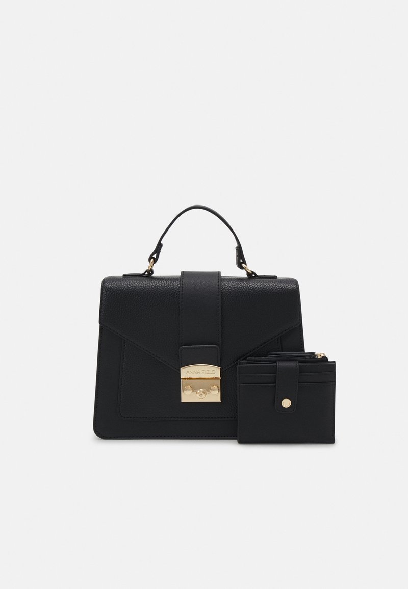 Sac à main noir texturé avec poignée supérieure et fermoir doré, à côté d'un portefeuille noir assorti avec fermeture éclair et emplacements pour cartes.