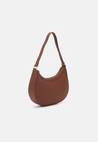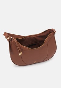 Sac à main en cuir marron en forme de croissant avec une seule bandoulière et un détail de tirette en or.