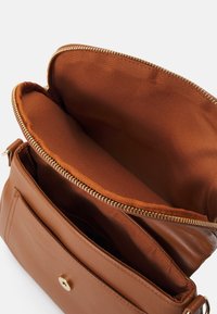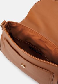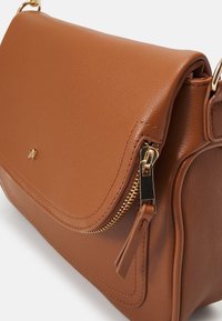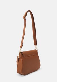 Sac à main en cuir marron avec fermeture à rabat, bandoulière réglable, garnitures dorées et petit logo en métal sur le rabat avant.