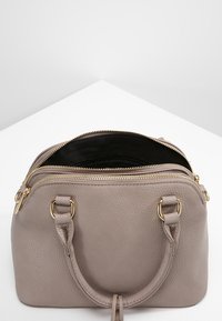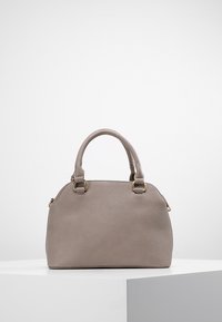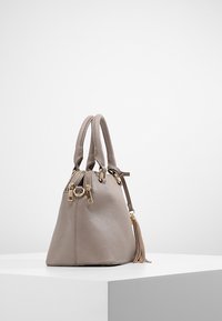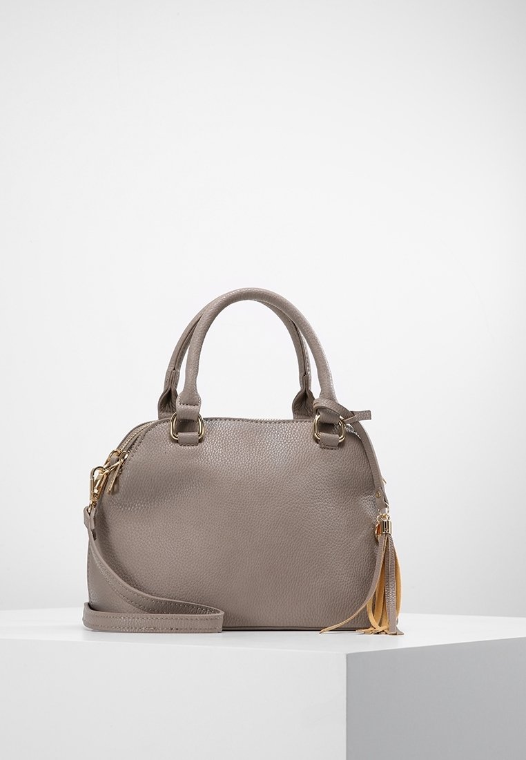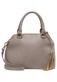 Sac à main en cuir grainé gris avec une forme arrondie, deux poignées courtes, une bandoulière amovible et des accents en métal doré. Comprend un détail de pompon.