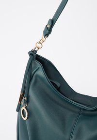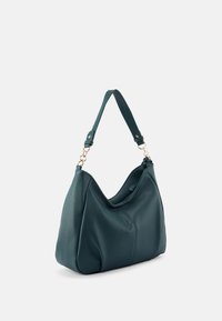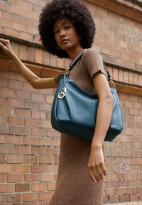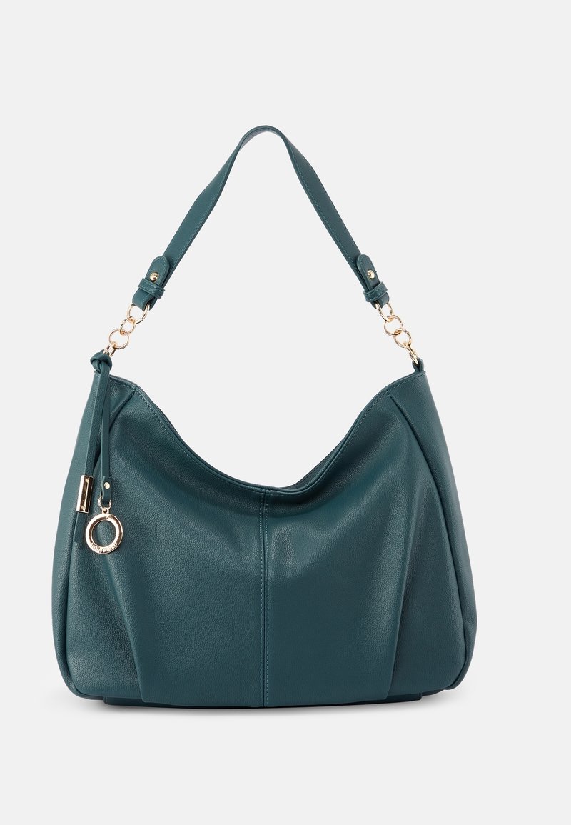 Sac à bandoulière en cuir bleu sarcelle avec des maillons de chaîne dorée sur la sangle et un pendentif rond doré attaché près du coin supérieur gauche.