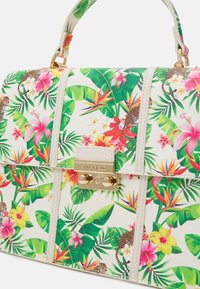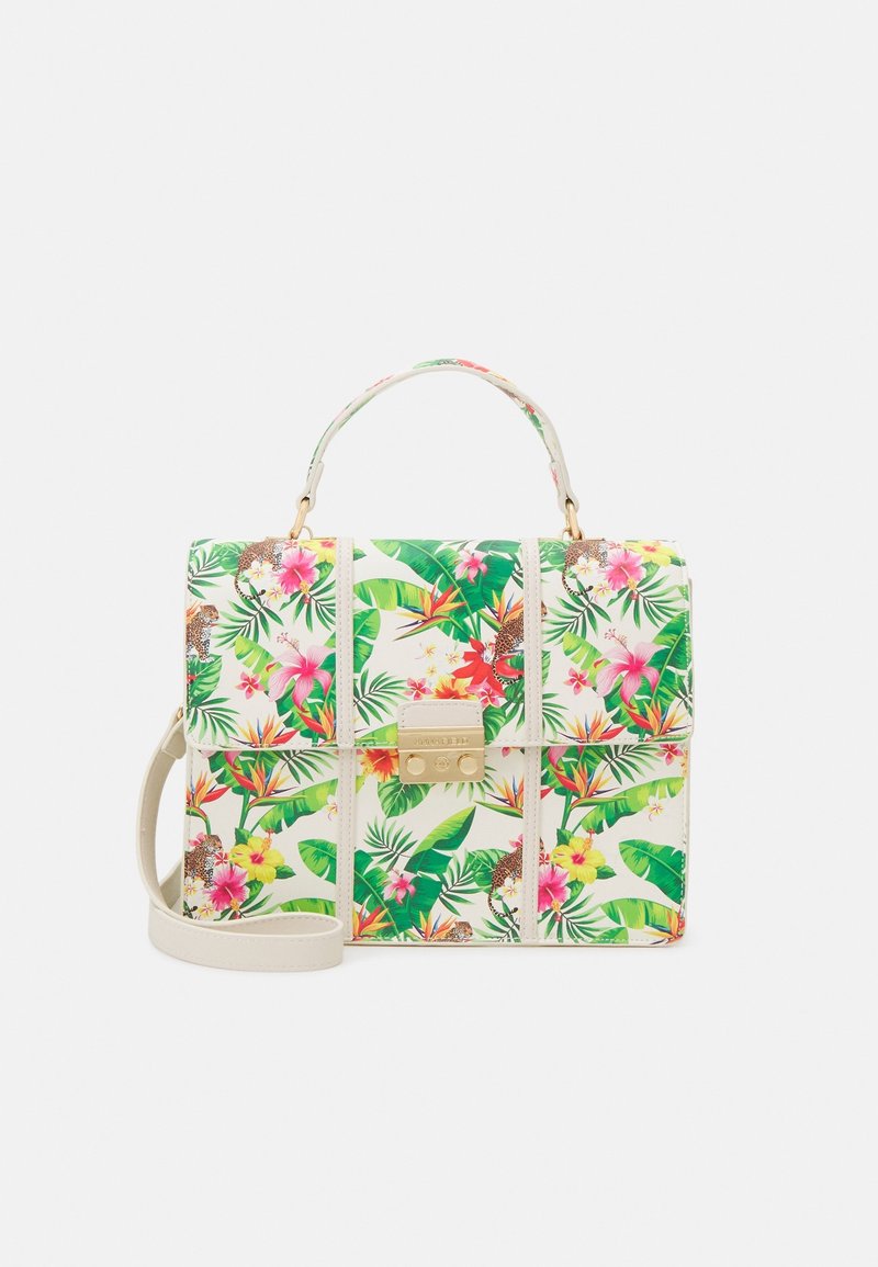 Sac à main rectangulaire avec imprimé tropical de fleurs et de feuilles, poignée et sangle beige, et verrou de fermeture à pêne doré sur le devant.