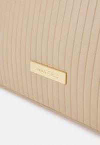 Sac à main beige avec texture côtelée verticale, doubles poignées, ferrures dorées et une petite plaque de marque rectangulaire à l'avant.