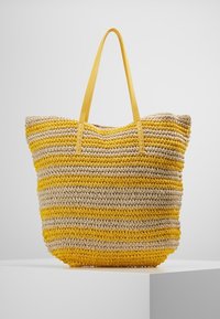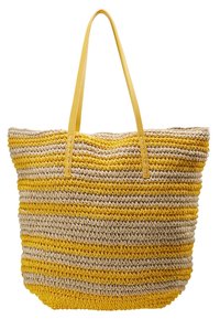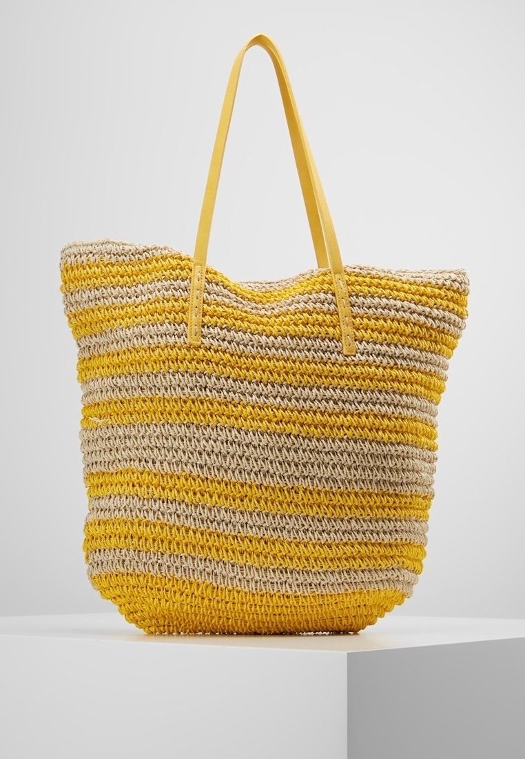 Sac cabas tissé rayé jaune et beige avec de longues poignées jaunes posé sur un piédestal blanc sur fond gris.