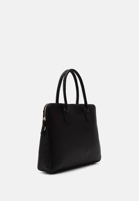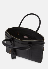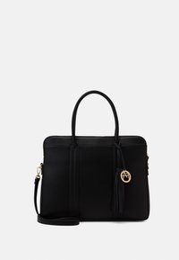 Sac à main en cuir noir avec deux poignées, bandoulière amovible, fermeture éclair, détail pompon et accents de quincaillerie dorée. Texture lisse.