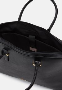 Sac à main structuré noir en matériau synthétique texturé. Comprend deux poignées supérieures, une bandoulière amovible et des accents dorés.