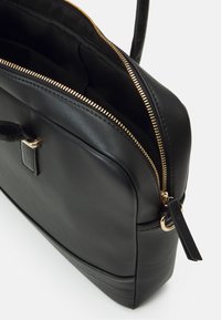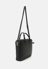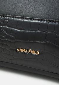 Sacoche rectangulaire noire en cuir pour ordinateur portable, avec deux poignées, une bandoulière amovible, des finitions dorées et le logo "ANNA FIELD" à l'avant.