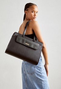 Sac à main rectangulaire noir avec deux longues anses, poche à rabat à l'avant avec une petite étiquette de marque dorée, et des clous dorés discrets sur les côtés.