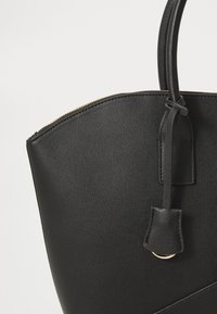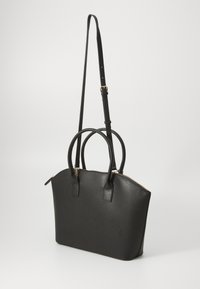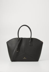 Sac à main en cuir noir avec deux poignées et une bandoulière amovible, équipé d'une fermeture éclair dorée et du logo "ANNA FIELD" à l'avant.