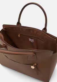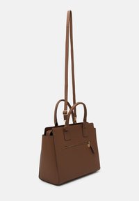 Sac à main en cuir marron avec deux petites poignées, une longue bandoulière, et une forme rectangulaire structurée sur un fond uni.