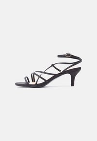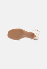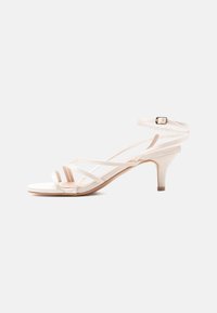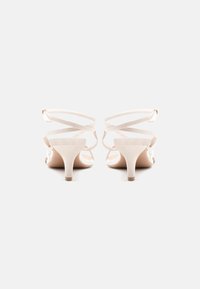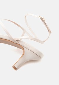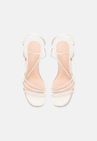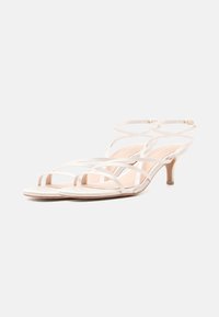 Sandale blanche à lanières, à bout ouvert, avec un petit talon et une bride à boucle autour de la cheville, sur un fond clair uni.