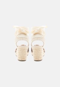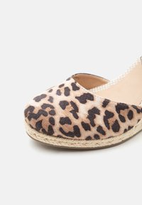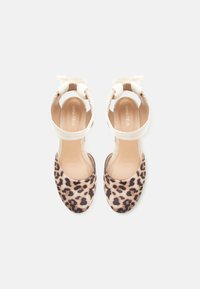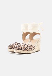 Espadrille à plateforme avec bout en imprimé léopard, talon en jute tressé et lien crème à nouer autour de la cheville sur fond blanc.