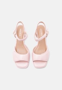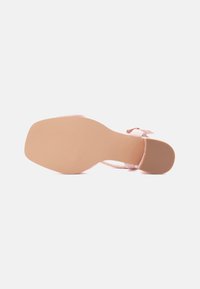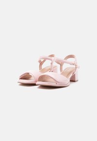 Sandale rose clair à bout ouvert avec bride de cheville réglable, petit talon bloc, et large bride avant avec fermeture Velcro.