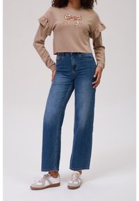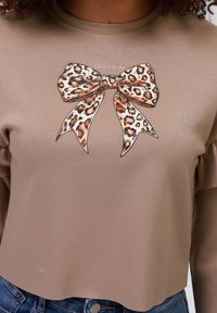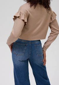 Femme portant un haut beige à manches longues avec volants et un nœud à imprimé léopard, jean bleu taille haute, main posée sur la hanche.
