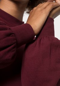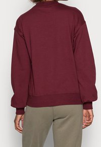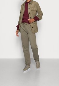 Personne portant un sweat-shirt bordeaux à manches longues et un pantalon marron clair, debout avec une main près du visage et l'autre détendue le long du corps.