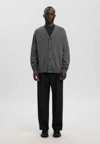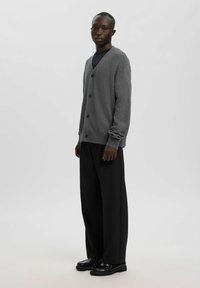 Homme portant un cardigan boutonné gris texturé sur une chemise noire et un pantalon noir ample, debout devant un fond clair uni.