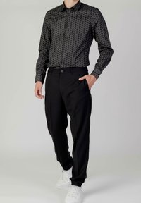 Homme portant une chemise noire à motifs avec des manches longues et un pantalon noir uni, une main dans la poche, sur un fond uni.