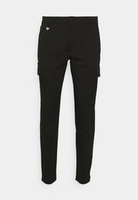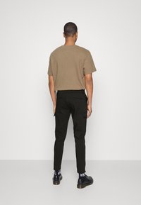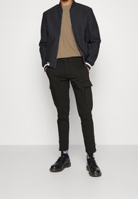 Homme portant un pantalon cargo slim noir, des chaussures noires à lacets, des chaussettes noires avec du texte blanc, et une chemise marron à manches courtes.