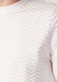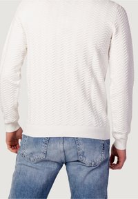 Homme portant un pull blanc à manches longues texturé avec un motif en chevrons et un jean bleu délavé, main droite dans la poche, sur fond uni.