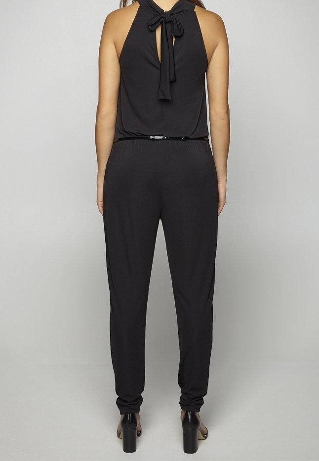Femme debout, de dos, portant une combinaison noire sans manches avec un nœud noué au niveau du cou et des chaussures à talons hauts noires.