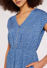 Robe bleue à manches courtes avec un décolleté en V et des motifs en forme de cœur blancs, cordon de serrage ajustable à la taille et un détail de fermeture éclair.